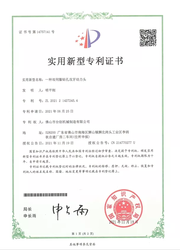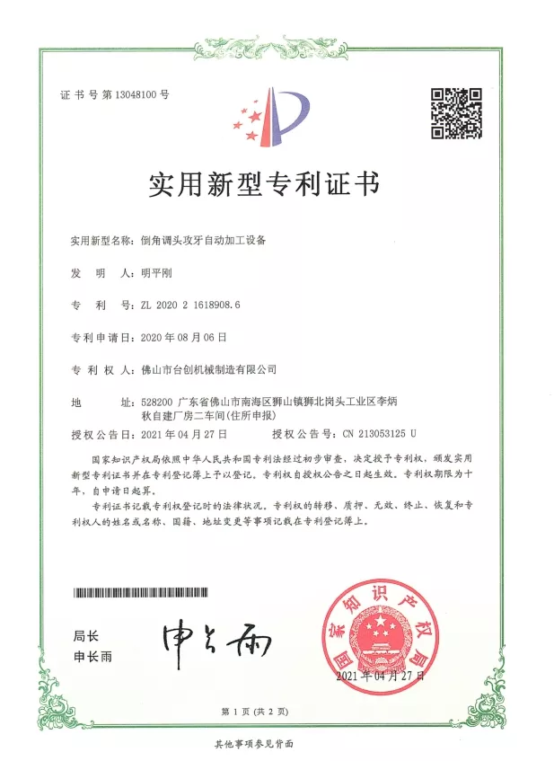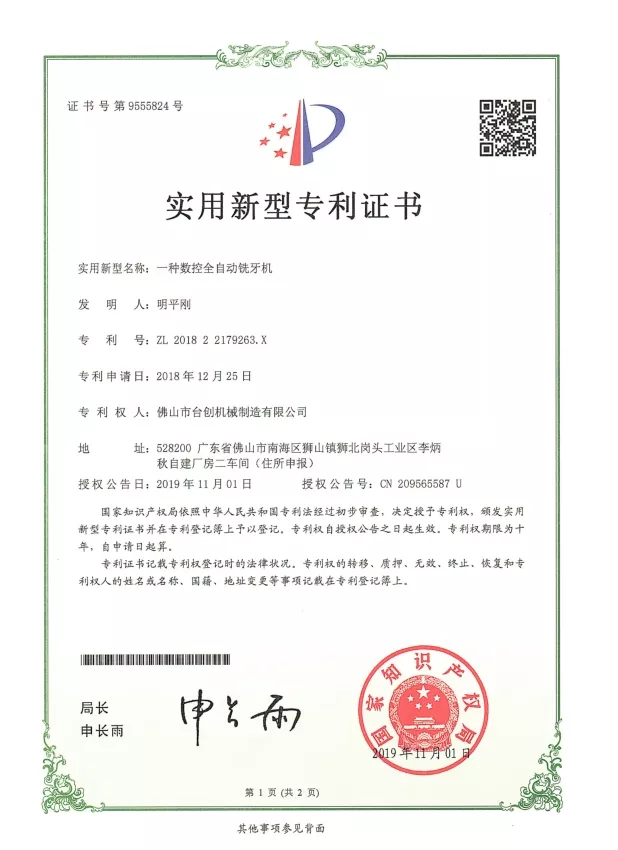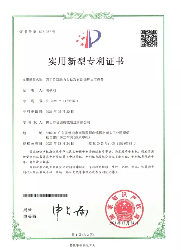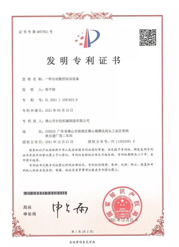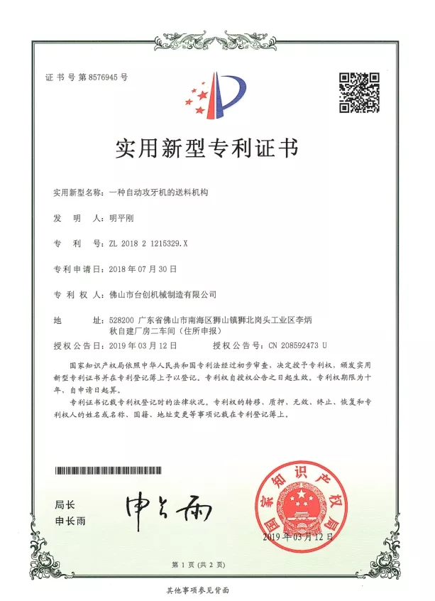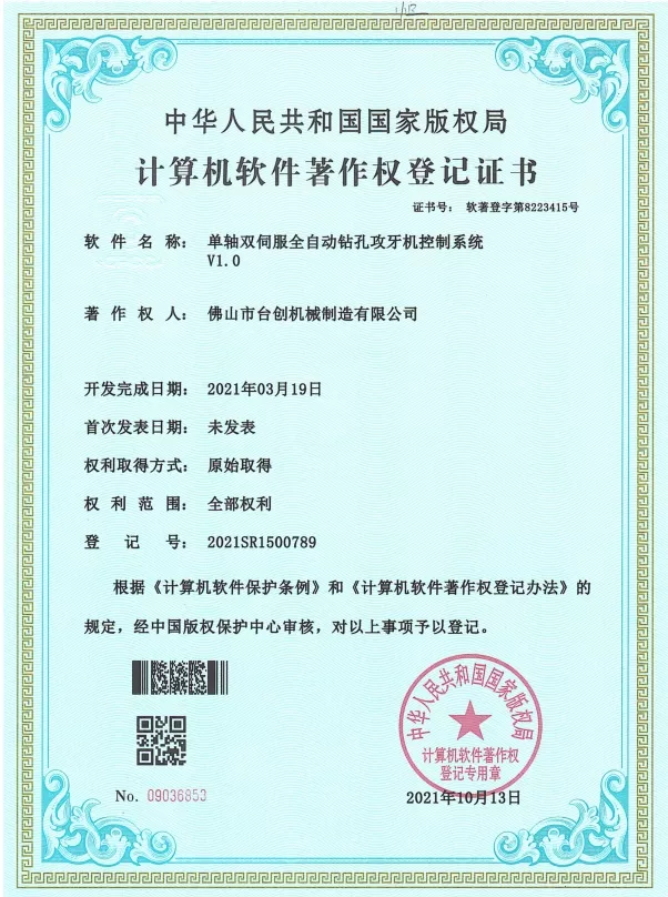 Brevets et innovation : nous détenons de nombreux brevets pour nos technologies de machines à tarauder les écrous, couvrant la conception mécanique, les systèmes d'automatisation et les solutions de sécurité. La recherche et le développement continus garantissent que nos machines offrent une précision, une stabilité et une efficacité élevées. L'innovation est appliquée aux systèmes CNC, aux servomoteurs, à la surveillance du couple et à la manutention automatique des matériaux pour répondre aux besoins changeants de la fabrication moderne.