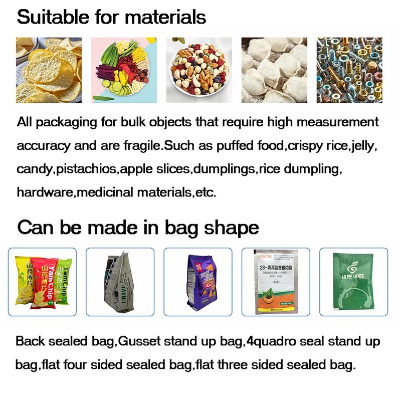 1. Entièrement automatisé : l'ensemble de l'équipement peut automatiquement compléter l'ensemble du processus d'alimentation → pesage → classement → fabrication de sacs → impression du numéro de lot → comptage de remplissage d'azote (échappement) → sortie du produit fini ; un ensemble d'équipements remplace 7 à 10 ouvriers manuels, améliorant considérablement l'efficacité de la production et réduisant les coûts de main-d'œuvre.